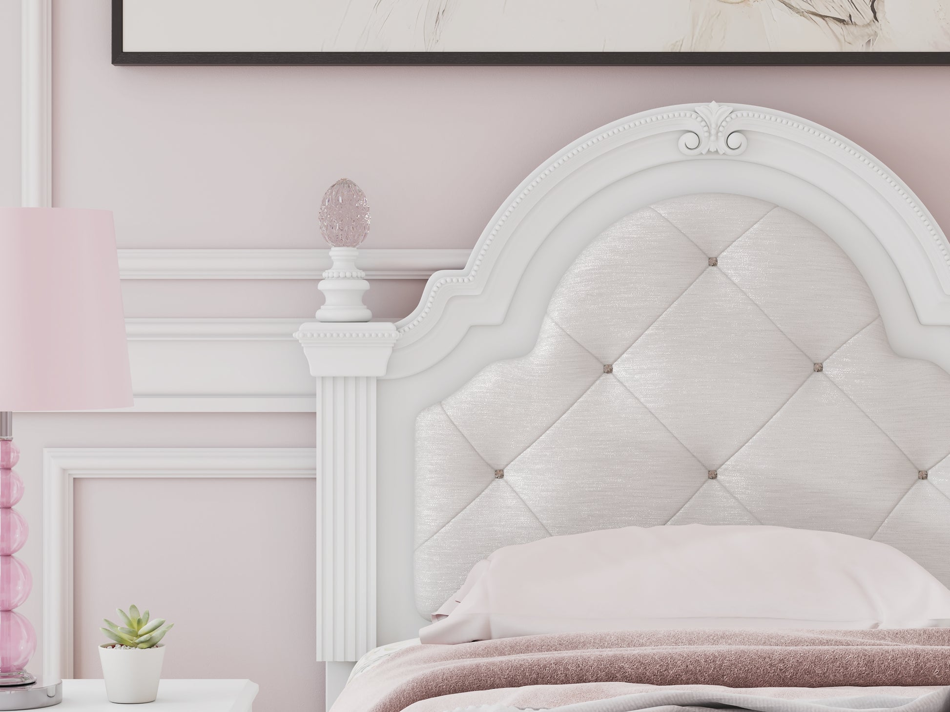 Fit for a princess. This twin upholstered panel storage bed’s crisp matte white finish pairs with charming ornate beading and sumptuous button-tufted upholstery—perfect for your girly girl. Spacious storage drawers neatly tuck away bedroom essentials. Decorative ball tops and multicolored LED lighting in the headboard are the crowning touches to make your little one feel like royalty.